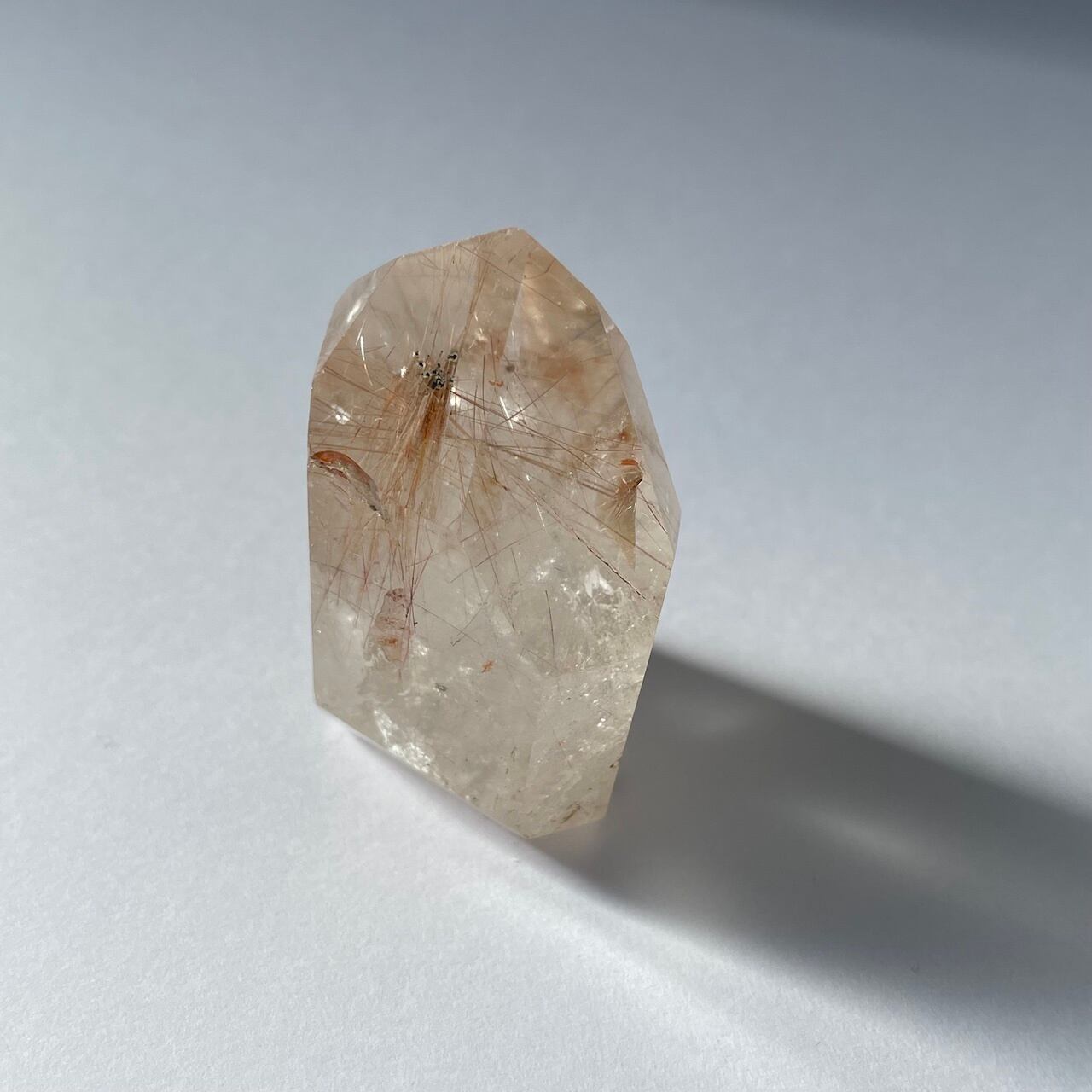 この石に入っているルチルは赤茶色に近い色のものが線状に入っているため、石の上部が少し赤っぽく見えます。