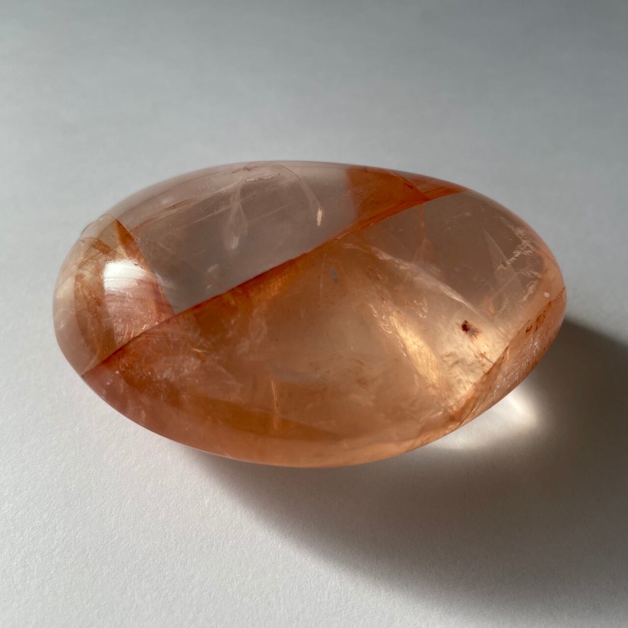 透明なクオーツ(水晶)の中に朱色のヘマタイトの条痕が見えます。